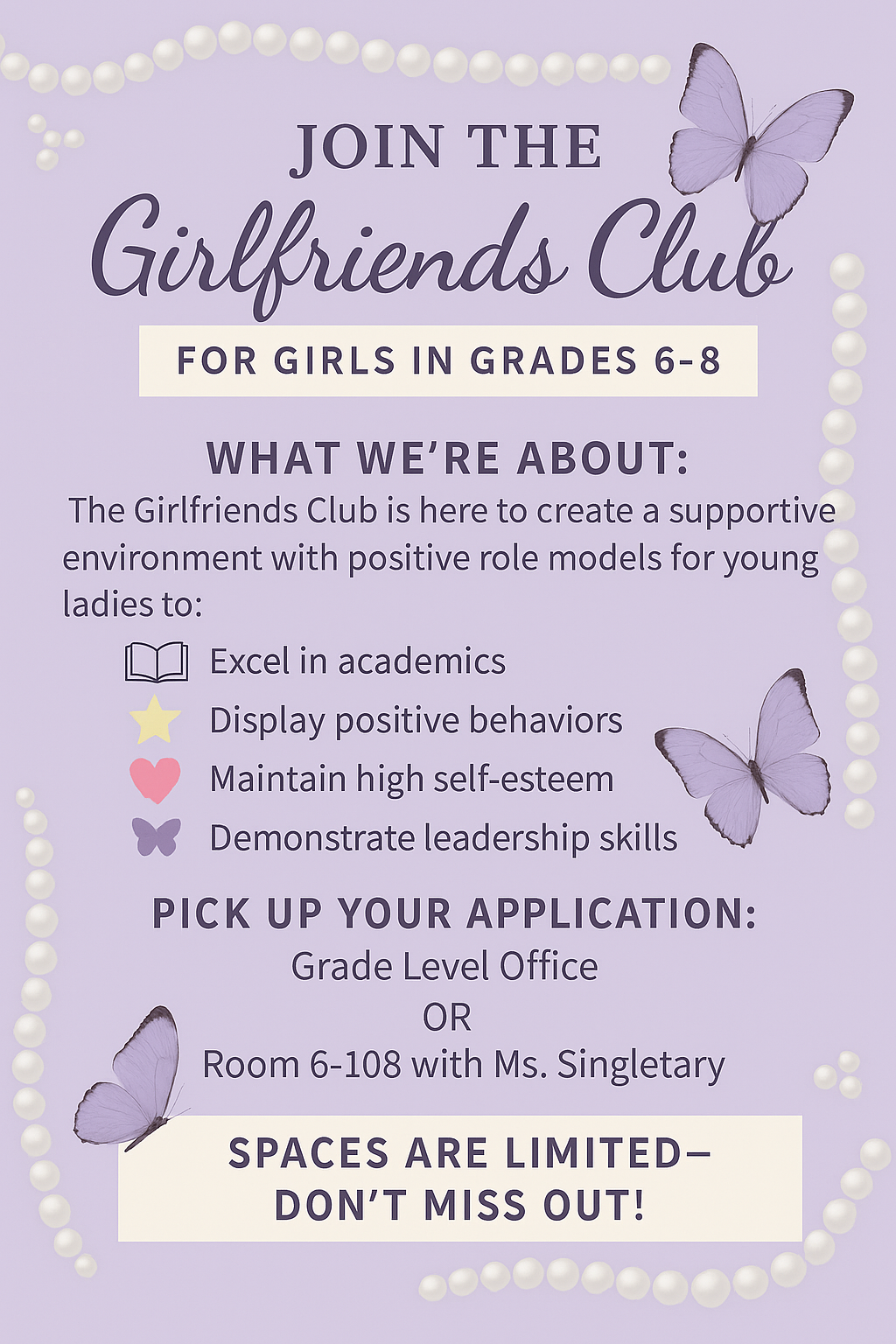 Girlfriends will met Bi-Weekly on Fridays from 8:30-9:30AM in Room 6-108. Applications are due Friday, September 12th! See Ms. Singletary or grade-level offices to pick up an application.