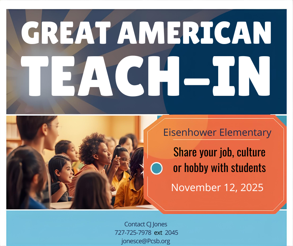 Would you like to be part of our 25-26 Great American Teach-In that will be held in November 12, 2025. Contact Celise "CJ" Jones at jonesce@pcsb.org for more information.