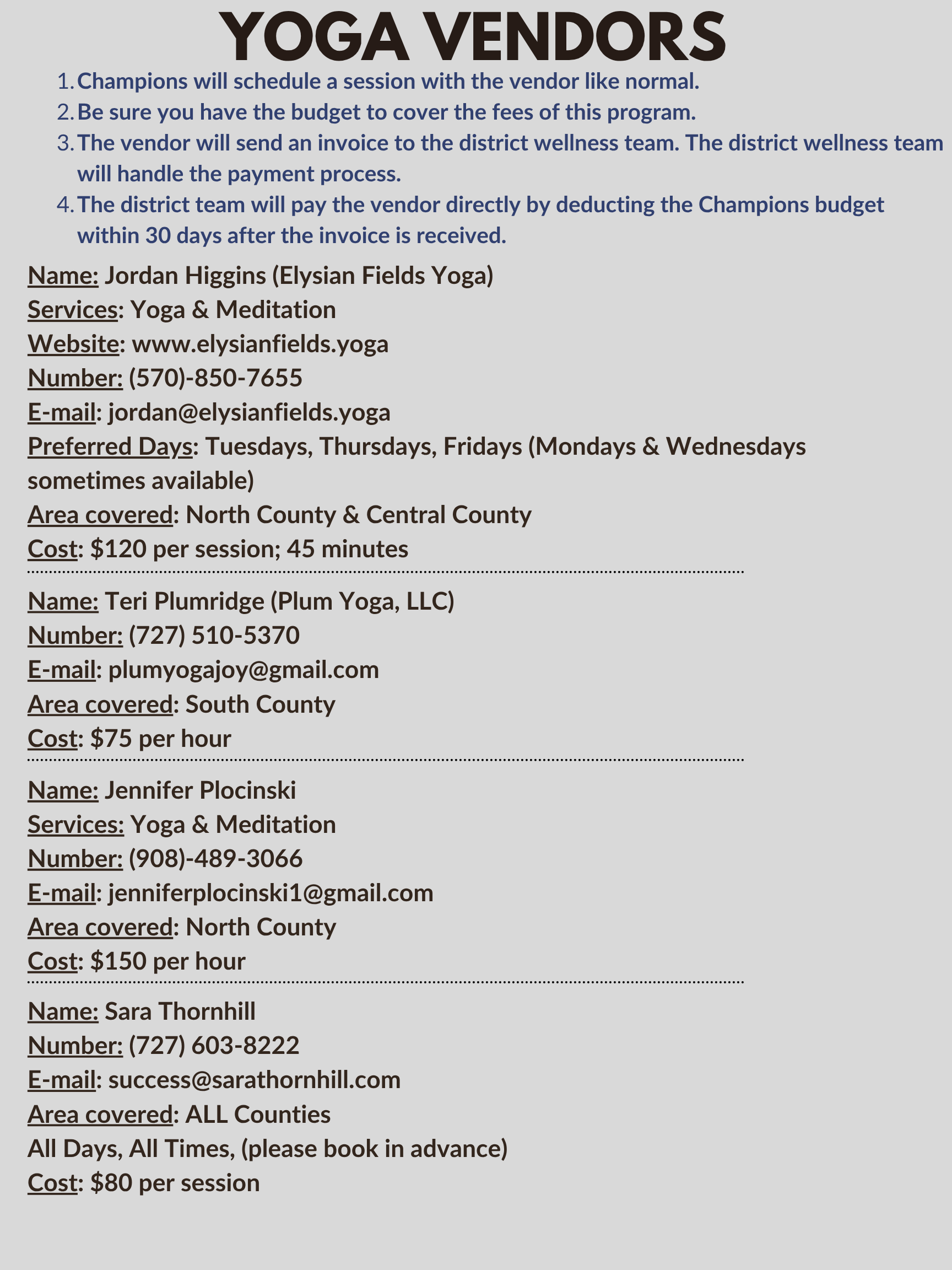 Below are the resources for the Employee Wellness Champion program. Please contact Caleigh Hill at hillca@pcsb.org for questions.