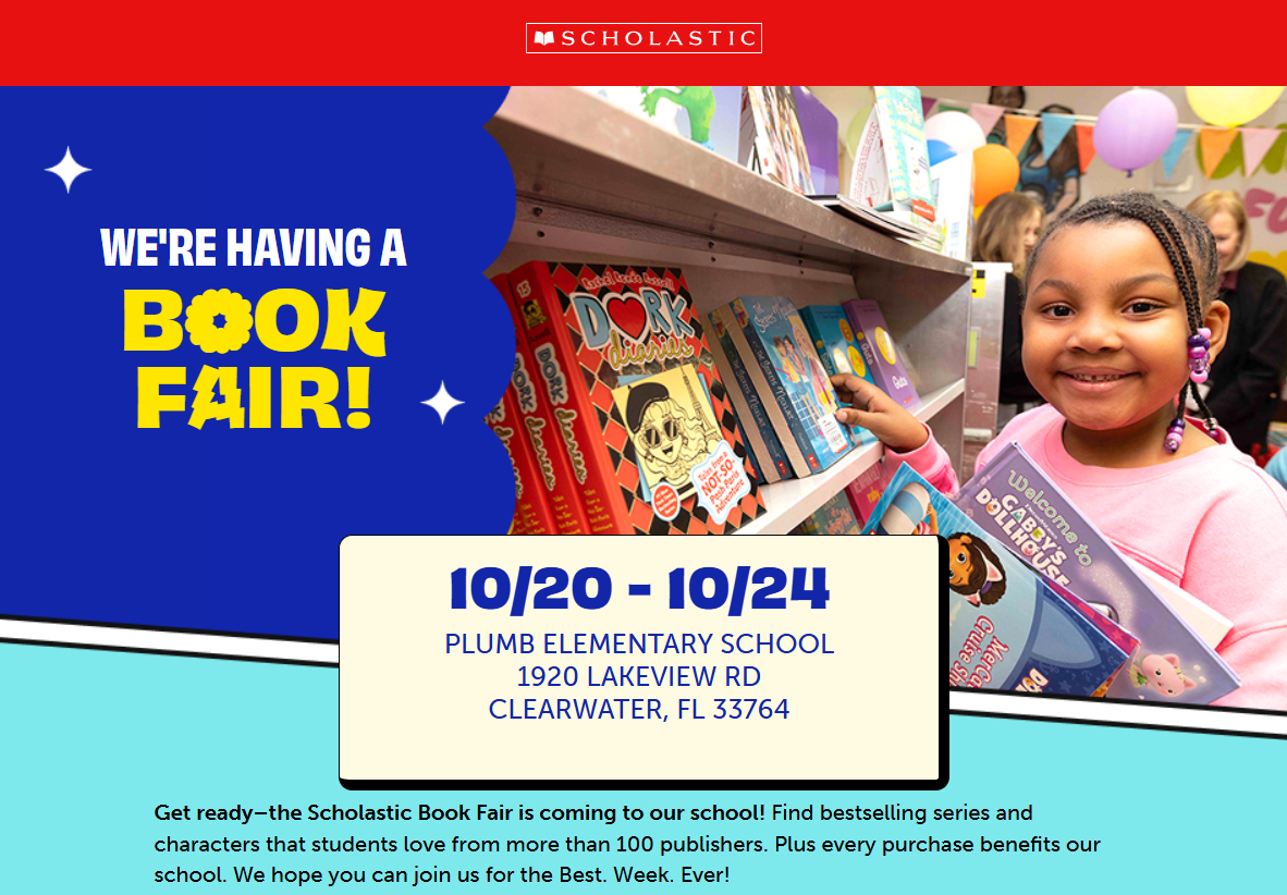 It’s time for the Book Fair! Our Scholastic Book Fair will take place on Monday October 20th through Friday October 24th
